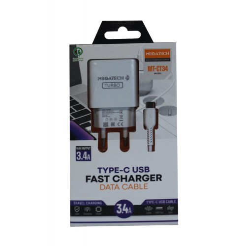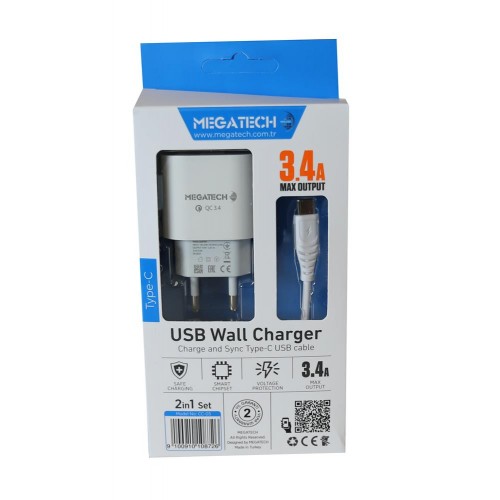 Megatech CC-03 (MT-Ct34 )3.4A Type-C Usb Kablo+ Ev Şarj Adaptör Hızlı Şarj