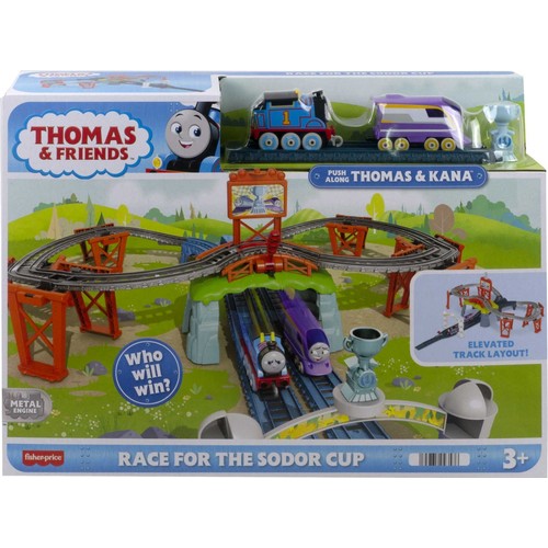 Fisher-Price 'ın sunduğu bu tekerlekli tren ve pist setiyle çocuklar, Thomas ve Arkadaşları çizgi filmindeki efsane Sodor Kupası yarış heyecanını tekrar yaşayacak. Çocuklar, Thomas ve Kana metal trenleri başlangıç kapılarına yerleştirebilir, ardından kolu çekip iki arkadaşın Cannonball Virajı boyunca hızla yarışıp bitiş çizgisine varmasını sağlayabilir. Pist seti, dostça gerçekleşen bu kıyasıya rekabete bambaşka eğlenceler katan virajlar ve dolambaçlı yollarla doludur. Bitiş çizgisine ilk kim ulaşacak ve kupayı kazanacak?