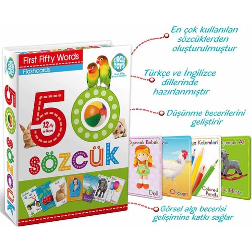 Circle Toys İlk 50 Sözcük İngilizce Türkçe Kartlar ile çocuklar hem eğlenecek hem de öğrenecek! çocuk eğitiminde kullanılması için hazırlanmış olan “50 Sözcük” seti, en sık kullanılan sözcüklerden seçilerek oluşturulmuştur. Türkçe ve İngilizce olarak hazırlanan “50 Sözcük” çocukların ilk bebeklik dönemlerinde doğal ortamlarında veya izlediği görsel yayınlarda karşılaştığı kavramları içerir. Nasıl Oynanır? “50 Sözcük” setinin içindeki dilediğiniz kartı seçiniz. Yüksek sesle karttaki görseli seslendiriniz. Seslendirmeyi dilerseniz sadece Türkçe veya İngilizce olarak yapınız. Bu çalışmalardan sonra kartları çoğaltarak herhangi bir görselin ismini seslendirebilir ve bebeğinizin bulmasını isteyebilirsiniz. Set içinde bulunan kartları; görsellerle masal anlatma, bulunduğunuz ortamda farklı yerlere koyarak istenen yönergelerle kartı bulma gibi farklı şekillerde kullanabilirsiniz. Kutu Ölçüsü: 20 x 8 x 25 cm.