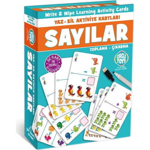 Siz değerli anne babalar ve öğretmenlerin çocuk eğitiminde kullanması maksadı ile hazırlanmış olan "Yaz-Sil Aktivite Kartları Serisi" toplama ve çıkarma işlemleri içeren 32 kart, 78 soru, 31 egzersiz ve silinebilen yazı kalemi ile kullanımınıza sunulmuştur. Yapılan işlem pratikleri ile çocuğunuzun işlem becerisine katkı sağlayacak olan kartlarımız öğrenmeyi daha eğlenceli hale getirmek için kullanıcıların ilgisini çekecek görsellerle hazırlanmıştır.