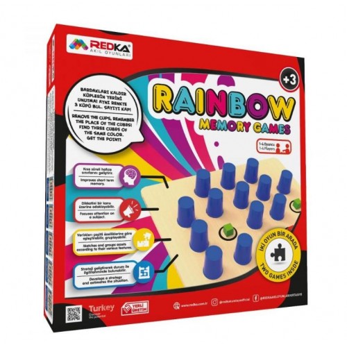 REDKA Rainbow Akıl Zeka ve Strateji Oyunu İlk oyuncu bardaklardan karışık sırada istediği 5 bardağı kaldırır. Amaç altı boş bardakları bulmaktır. Altı boş 5 bardağı bulan oyuncu tüm bardakları alır ve boş kalan yerlere küpleri koyar. Bardakların herhangi birinde küp olursa sıra rakip oyuncuya geçer. Altı boş bardakların tamamı bulunana kadar oyun devam eder. Oyuncular 3'er set halinde bardakları kaldırır. Hedef bardakların altındaki aynı 3 rengi bulup bardakları toplamaktır. Bardakların altında farklı renk çıktığında sıra rakibe geçer. En fazla bardağı toplayan kazanır. *Yaş 6+