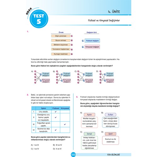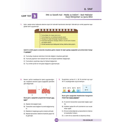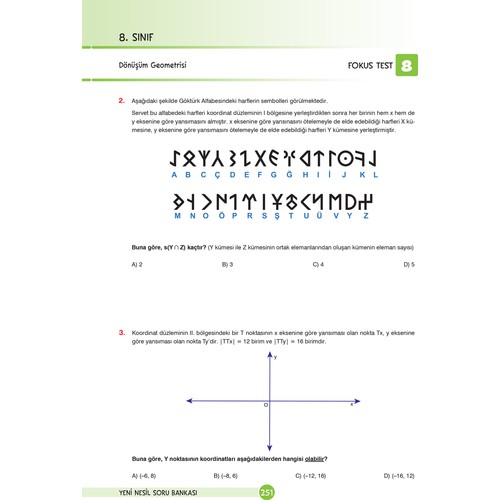 8. Sınıf LGS Eğlenceli Öğretici Sorularla Yeni Nesil Soru Bankası Seti Ailelere, Öğretmenlere ve Eğitimcilere Bir Not Yarının geleceği öğrencilerimiz için hazırlanmış olan 8. Sınıf LGS Yeni Nesil Soru Bankası Seti kitaplarında Mercek Test, Odak Test ve Fokus Testle bilgiyi edinme, analiz etme ve sentezleme aşamalarından geçecektir. Kanguru/Kamp Test aşamasında ise yeniden yorumlama ve değerlendirme basamaklarıyla öğrenilen bilginin kalıcılığının sağlanması hedeflenmiştir. 1. Aşama (Mercek Test): Öğrencinin konuyla ilgili öğrendikleri üzerine mercek tutarak konun temel düzeyde öğrenilip öğrenilmediğini kontrol eder ve varsa eksiklerinin tamamlanmasına yardımcı olur. 2. Aşama (Odak Test): Öğrencinin temel düzeyde kazandığı becerileri bir üst düzeye taşımaya odaklanmış orta düzey sorulardan meydana gelir. Böylece beceri temelli soruları çözmeye bir adım daha yaklaşılır. 3. Aşama (Fokus Test): Bu aşamada kazanımları gelişen öğrencinin fokuslanarak sahip olduğu becerileri kullanabileceği üst düzey sorulardan oluşur. Kanguru/Kamp Test: Bir öğrenim yılında olan dört adet (1. Çeyrek, 1. Dönem, 2. Çeyrek, Yıl sonu) tatil dönemleri için o zamana kadar işlenen konuları içeren sorulardan oluşur. Bu testler beceri temelli öğrenilen bilgilerin en iyi şekilde kullanılmasını sağlar. Bilgiyi eğlenceli hale getiren bu kitaplar; kendine güvenen, öğrenmeye meraklı, akıl yürütebilen öğrencilerin yetişmesini sağlayacaktır. Her bir soruyla öğrencinin, bilgiyi keşfederken dikkatini kullanarak bilgiye odaklanması, önceden öğrenilen bilgilerle yeni bilgilerin çıkarımını yaparak analiz etmesi sağlanmıştır. Bu kitaplarda yer alan sorular; öğrencinin karşılaştığı zorluklarla mücadele edebilmesi, karşılaştığı zorluğu tüm boyutlarıyla inceleyebilmesi ve öğrendiklerini sosyal yaşama aktarabilmesi için tasarlanmıştır. Yeni nesil sorularla; öğrencilerin eleştirel düşünme becerisini geliştirerek duyduğu, okuduğu ve gördüğü kavramları, olayları farklı açılardan ele alarak değerlendirebilmesi amaçlanmıştır. Uzmanlar tarafından hazırlanan 8. Sınıf LGS Yeni Nesil Soru Bankası Seti Milli Eğitim Bakanlığı kazanımlarına göre hazırlanmıştır. Bu kitaplar evde ve okulda öğrenmeyi pekiştirir. Unutmayın! Başarıyı kalıcı hale getirmek için tekrar çok önemlidir. Bu kitaplar her bir ünitede bol bol tekrar yapmanızı sağlayarak bilgiyi kalıcı hale getirecektir.