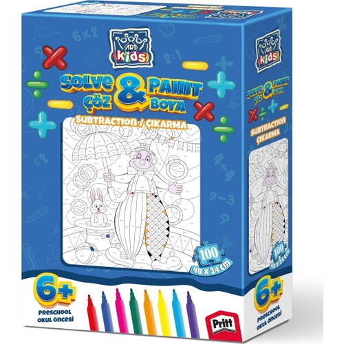 • Açıklama :Art Kids Çöz Boya serisinde Toplama, Çıkarma, Çarpma ve Bölme’yi kapsayan, dört işlemin tamamını, boyama yaparak ve yapboz parçalarını birleştirerek, çocuklarımız keyifli ve kalıcı şekilde öğrenme fırsatı bulacaktır. Tamamen sürdürülebilir ham maddelerden üretilen, çevre dostu ürünlerimiz ile çocuklarımızın güvenle öğrenmelerine katkıda bulunacak ürünlerimiz, gerekli tüm kalite standartlarına uygun bir şekilde çocuklarımızın beğenisine sunulmaktadır. Çöz Boya serisini faydaları; • Matematik ve sayılara karşı oluşan kaygı durumunun azalmasına yardımcı olur • Resim kabiliyetini geliştirmek için keyifli ve eğitici bir yoldur • Görsel hafızanın gelişmesine katkıda bulunur • Sayıları ve renkleri öğrenmede ciddi bir rol oynar • El becerilerinin gelişmesine katkıda bulunur • Zihinsel gelişim için etkin bir rol oynar Nasıl Yapılır ? 100 Parça Puzzle tamamlanır. Boyanması gereken bölümler işlem sonucu karşılığındaki gösterilen renkte boyanır. Kutu İçeriği : 100 Parça Puzzle 12’li pritt keçeli kalem