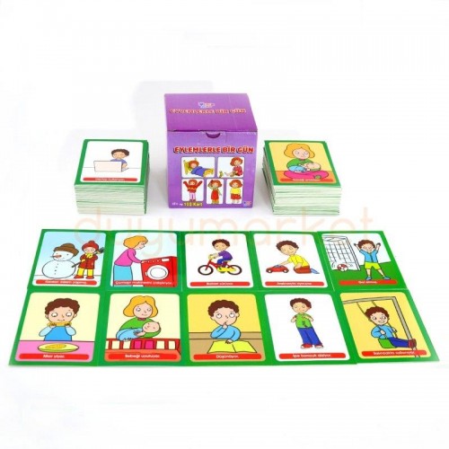 Eylemlerle Bir Gün Yuka Kids Dil: Türkçe; Barkod: 9786059039338; Çıkış Tarihi: 2017; Hazırlayan: Kolektif; 112 büyük boy (10x12 cm) resimlerden oluşan bir settir. Çocuğun bir gününü eylemlerle ifaden eder. EĞİTİM KARTLARI İLE ÇALIŞMA YAPARKEN; Bebeğinizle karşılıklı oturunuz. Kartı bebeğinize 30 cm uzaklıktan gösteriniz. Bebeğinize resmi incelemesi için fırsat tanıyınız. Eğitim kartlarını 18. aydan itibaren kullanmaya başlayınız. Kartları konuşma safhasındaki bebeğiniz ile öğreterek konuşmaya yeni başlayan bebeğiniz ile de sorular sorarak kullanınız. Karttaki nesnenin ifadenin ya da hayvan adını adını net ve anlaşılır şekilde söyleyiniz. Sorular sorarken ya da cevapları verirken bebeğiniz ile göz teması kurunuz. Kart ebadı: 10x12 cm Kart cinsi: Bristol karton Kart sayısı: 112 adet Yaş grubu: 18+ ay SIRALI EYLEMLER Uyanıyor Yatağını topluyor Tuvaletini yapıyor Elini yıkıyor Yüzünü yıkıyor Saçını tarıyor Çorabını giyiyor Pantolonunu giyiyor Kazağını giyiyor Sofrayı kuruyor Kahvaltı yapıyor Montunu giyiyor Çantasını takıyor Kapıyı açıyor Servisi bekliyor Servise biniyor Servisten iniyor Okula giriyor Sınıfta sırasında oturuyor. OKUL EYLEMLERİ Yazı yazıyor Düşünüyor Parmağını kaldırıyor Tahtada yazı yazıyor Kitap okuyor Resim yapıyor Flüt çalıyor Şarkı söylüyor Dans ediyor Top oynuyor Gol atıp seviniyor Voleybol oynuyor Basketbol oynuyor GENEL EYLEMLER Yoruluyor Terliyor Su içiyor Parka gidiyor Salıncakta sallanıyor Kaydırakta kayıyor Trambolinde zıplıyor Kapının ziline basıyor Eve giriyor Annesini öpüyor Ellerini yıkıyor Meyve yiyor Televizyon seyrediyor Ders çalışıyor Sıkılıyor Hayal kuruyor Telefonla konuşuyor Bilgisayar kullanıyor Arabasıyla oynuyor Annesi yerleri siliyor Annesi ütü yapıyor Annesi yemek yapıyor Bahçeye çıkıyor Bisiklet sürüyor Bisikletten düşüyor Kolu inciniyor ağlıyor Çiçekleri suluyor Çiçekleri kokluyor Tavuklara yem veriyor Saklambaç oynuyor Misket oynuyor Ağaca tırmanıyor Yağmur yağıyor Islanıyor Üşüyor Banyo yapıyor Akşam yemeği yiyor Pijamalarını giyiyor Dişlerini fırçalıyor Yatağa giriyor Annesi ona masal anlatıyor Uyuyor SIRALI EYLEMLER Midesi ağrıyor Hapşırıyor Hastalanıyor Ambulansa konuluyor Doktor muayene ediyor İğne vuruluyor Diş doktoru dişini çekiyor DUYGULAR Köpeği görüp korkuyor Köpek ısırıyor Seviniyor Kahkaha atıyor Yemeği itip tiksiniyor Sürpriz doğum gününe şaşırıyor Kardan adam yapıyor Burnunu siliyor