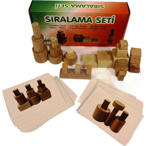 24 adet ahşap blok 24 adet görev kartı Bu set Montessori ilkeleri doğrultusunda hazırlandı. Çocuk, sıralama, gruplama becerisi kazanırken, aynı zamanda uzamsal algısı ve görsel dikkati gelişir. Bütün (1/1), yarım (1/2) ve çeyrek (1/4) kavramlarını verirken aynı zamanda kesirlere ve bölme işlemine bir başlangıç sağlamış olursunuz. Önce büyük, küçük, uzun, kısa, kalın ince vb. basit kavramları öğretin. Sonra, büyükten küçüğe, küçükten büyüğe, uzundan kısaya, kısadan uzuna, kalından inceye, inceden kalına, yüksekten alçağa, alçaktan yükseğe alıştırmalarını yaptırın. Kartlarda verilen örneklere bakarak yapmasını sağlayın. Kendisi de hayal gücünü kullanarak yeni tasarım yapılar ortaya çıkarsın.