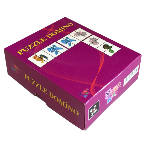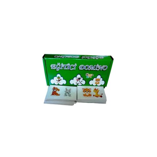Yaş grubu: 3-6 Yaş Domino, iki ya da daha çokkişi arasında "pul", "kart", "domino" gibi adlar verilmiş 28 tane dikdörtgen biçiminde yassı taşla veya kartla oynanan bir oyundur. Her taşın bir yüzü enlemesine çizgiyle ikiye ayrılmış ve üzerindeçeşitli resimler vardır. Oyunda amaç uç resimleri ortak olan kartlarıeşleştirerek dizmektir. Örneğin, inek-kedi kartı yerde ise, kedi veya inekresimlerinin olduğu bir kart eşi olan tarafa konulur. Oyun iki, en fazla dörtoyuncuyla oynanır. Oyuna başlarken kartların yüzleri yere dönük olarak karıştırılır ve üstü üste gelecek şekilde tamamı masaya bırakılır. Oyuncular, sırayla 7’şer kart alır. (4’ten az oyuncu varsa)geriye kalan taşlar oyun boyunca birer birer oyuncular tarafından çekilir. İlk oyuncu herhangi birkartını yüzü üste gelecek biçimde masaya koyar. İkinci oyuncu bu taşın yanına,taşın iki ucundaki resimlerden biriyle eşleşen kartını yerleştirir. Elinde eşleyecek bir kartı olmayan oyuncu uygun bir kart gelinceye kadar masadaki kart bloğundan kart çekmeye devam eder. Elindeki kartları ilk bitiren oyuncu oyunu kazanır. Diğer oyunculara, ellerinde kalan kart sayısı kadar ceza puanı yazılır. Hiçbir oyuncu elindeki kartı bitirememişse, elinde en az sayı olankişi oyunu kazanır. 28 kart (45x55 mm)
