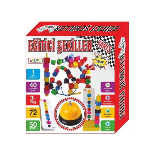 • Line up ring eğitici şekiller yarış oyunu. EĞİTİCİ ŞEKİLLER YARIŞ OYUNU Kutu İçeriği: 7 farklı renkte 40 adet değişik şekil ve renklerden oluşan boncuk 1 adet sıralama standı 2 adet sıralama çubuğu 2 adet sıralama dik duran çubuğu 2 adet ipli sıralama çubuğu 50 Adet kaliteli soru kağıdı 1 adet metal zil Geometrik şekilleri sıralamak için özel uçlu iplikler ve stand. Eğitici Şekiller ne işe yarar: Çocukların motor beceri gelişimine faydalıdır. Örüntü kavramını öğrenmelerine yardımcı olur. Uzamsal algılanını geliştirir. Farklı renk ve şekilleri dizmek için gösterdiği çaba görsel algı gelişimine fayda sağlar. Düşünme becerilerinin gelişiminde etkilidir. Eğitici Şekiller nasıl oynanır: Bir veya iki kişi ile oynanabilen Sıralama, verilen soru kartlannin doğru bir şekilde standa, ipe veya çubuklara dizilmesi ile oynanir. Oyun iki kişi ile oynanıyorsa soru kartını çubuğa ya da ipe doğru şekilde dizen ilk oyuncu kazanır. Oyun, kullanıcının istediği şekilde farklı yöntemler kullanılarak da oynanabilir. Örneğin