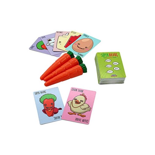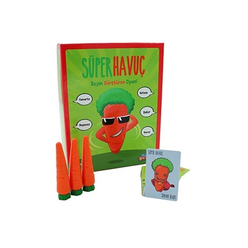 • Beyin Sürçtüren Oyun! Şaşırmam demeyin, söylediklerinizle attığınız karta dikkat edin! Tek yapmanız gereken attığınız kartla söylediğiniz kelime eşleştiğinde havucu kapmak! Kolay mı sandınız? Bu esnada beyniniz size oyunlar oynayacak, adeta beyniniz sürçecek ama sonunda ne olursa olsun eğlenen siz olacaksınız! Bol şans! Nasıl Oynanır? Eğlenceyi ve heyecanı yüksek dozda hissettiren, bir o kadar da beyin sürçtüren oyun Süper Havuç ile hem kafanız çok karışacak hem de çok eğleneceksiniz! YUMURTA, KETÇAP, MAYONEZ, SEKER, HAVUÇ! Bu kelimeleri aklınızda çok iyi tutun ve sıralamayı sakın şaşırmayın! Bu kelimeleri sırasıyla söyleyerek kartınızı açın. Eğer oyuncunun söylediği kelimeyle ortaya açtığı kart eşleşirse (örneğin sırası gelen oyuncu MAYONEZ kelimesini söyler ve açtığı kartta mayonez görseli varsa), tüm oyuncular ortadaki havuçlardan bir tanesini en hızlı şekilde kapmaya çalışır. Hızlı davranamayıp havuç kapamayan oyuncu ortada biriken açık kartların hepsini alır. Elindeki kartları önce bitiren oyuncu oyunu kazanır. Oyuncu Sayısı: 2 - 4 İçindekiler