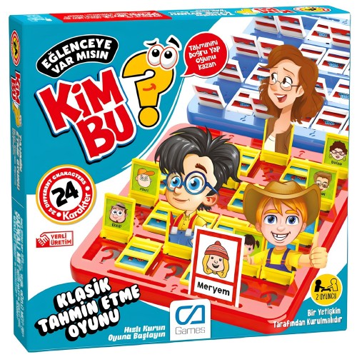 Ca Games Kim Bu? Kutu Oyunu 3 yaş ve üzeri için uygundur. 2 oyuncuyla oynanan tahmin oyunudur. Bu oyun bir yetişkin tarafından kurulmalıdır. Oyun amacı; gizli karakteri ilk bulan olmaktır. Kura ile oyna başlayın. Sırasıyla birer soru sorun. Arkadaşınızın kartındaki gizli karakter hakkında evet yada hayır cevabını verin. Alınan cevaba bağlı olarak elediğiniz karakterin üzerindeki pencereleri kapatın. Bu şekilde her soruda karakteri bulmaya daha yakın olun. Karakteri tahmin ettiğinizde sıra size geldiğinde tahmininizi söyleyin. Yanlış tahminde bulunursanız oyunu kaybedersdiniz. Kutu içindekiler. 2 oyun alanı, 48 karakter kartı ve 24 gizli karakter kartı.