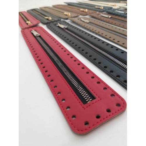 Suni deri kullanılmıştır. Ebatları 30X5.5 cm'dir. Renk ve Metal seçenekleri ayrı ayrı yüklenmiştir. Kenarlarındaki delikler tığ ile monte etmek için tasarlanmıştır. Dikerek de montaj yapılabilir. Örgünün kendi ipi ile montajı yapılabilir. Tek olarak gönderilir.