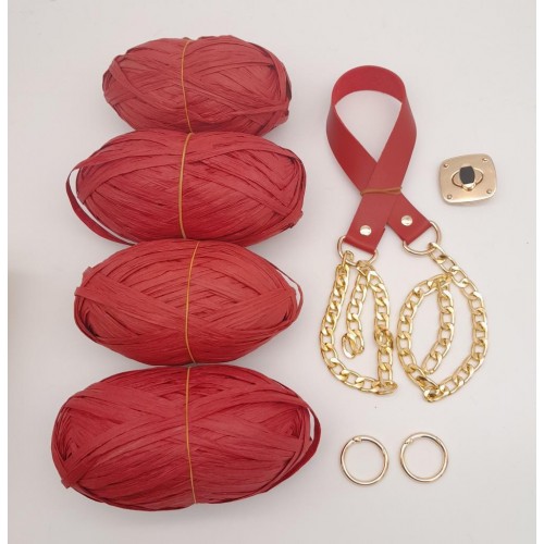 Çanta Aksesuar Rafya Ve Kırmızı Renk Zincirli Sap Çanta Seti
