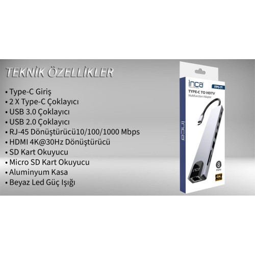 Inca ITPC-7T Type-C Giriş 2XType-C Çoklayıcı RJ-45 HDMI 4K@30 USB 3.0 Çoklayıcı Micro SD Kart