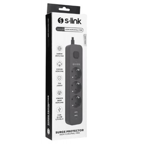 S-link SPG03U 5V2.4A 1.5m 3x1.00mm 100 yüzde Bakır 750 Joule 3 lü Anahtarlı Akım Korumalı Siyah Priz