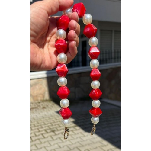 Çanta Aksesuar 40 cm Kırmızı Renk İncili Çanta Sapı Kancalı