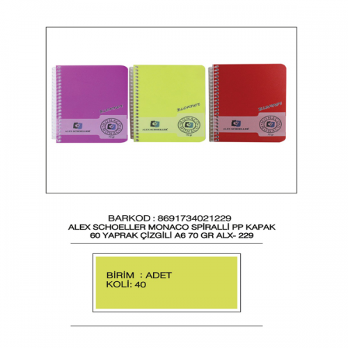 Alex Schoeller Spiralli Defter Plastik Kapak Çizgili 60 Yaprak A6 ALX:229 (1 Adet)