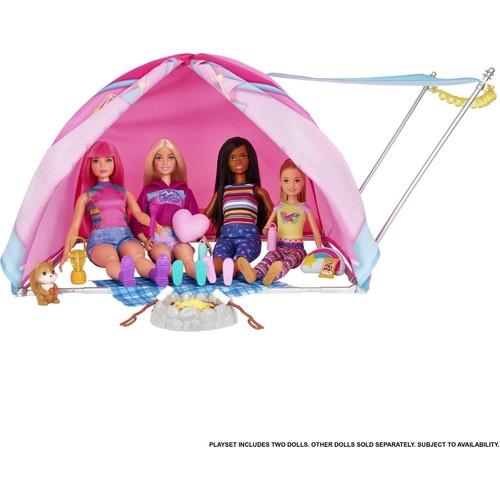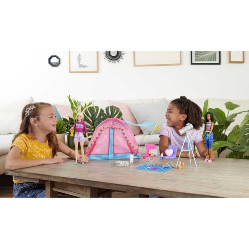 Barbie® "Malibu" Roberts, Barbie® "Brooklyn" Roberts, bebeklerin kendi çadırları ve çok sayıda temalı aksesuarın yer aldığı bu muhteşem Barbie It Takes Two™ oyun setiyle açık havanın keyfini çıkarın. Branda ve ışık şeridiyle dekore edilmiş ekstra büyük kumaş kamp çadırına dört bebek sığabilir. Çocuklar kamp kurabilir ve katlanır sandalyeleri, teleskobu, ateş çukurunu, marshmallow kızartma çubuklarını, kart oyununu ve daha birçok parçayı kullanarak yıldızlar altında kamp hikayeleri canlandırabilir. Hatta ziyaretlerine gelen iki orman hayvanı dostlarını bile ağırlayabilirler. Sevimli kamp kıyafetleri giyen iki bebek ve çok sayıda aksesuar, 3 yaş ve üzeri çocuklara hayal edebilecekleri sınırsız açık hava maceraları sunar. Bebekler tek başına ayakta duramaz. Renkler ve süslemeler çeşitlilik gösterebilir. Bu Barbie It Takes Two™ oyun seti, Barbie® "Malibu" ve Barbie® "Brooklyn" Roberts ile açık hava maceralarına ilham verir. En iyi arkadaşların mükemmel kamp alanını yaratmak için ihtiyaç duyduğu her şey bu sette sizi beliyor. Brandası ve çok havalı ışık şeridi bulunan bu ekstra büyük kumaş çadıra 4 bebek sığabilir. Oyun setinde kamp kurmanız için ateş çukuru, 2 katlanır sandalye, bir battaniye ve teleskop bulunur. Ziyaretinize gelen sevimli hayvan dostlara selam vermeyi unutmayın. Tavşanın kuyruğuna bastırdığınızda kulaklarını sallar, sincabın kuyruğuna bastırdığınızda ise meşe palamudunu yemeye başlar. Marshmallow kızartma çubukları, fener, kart oyunu, el feneri, atıştırmalık, 2 su şişesi ve 2 renkli yastık ile yıldızlar altında kamp hikayelerinin tadını çıkarın. Bu en iyi iki arkadaş, sevimli kamp giysileri giyer. Barbie® "Malibu" bebeğin kapüşonlu üstü ve rengarenk şortu, Barbie® "Brooklyn" bebeğin ise çizgili atleti ve yıldız baskılı pantolonu vardır. 2 Barbie® bebeği ve çok sayıda havalı kamp aksesuarı içeren bu Barbie It Takes Two™ oyun seti, 3 yaş ve üzeri çocuklar için sınırsız açık hava maceralarına ilham verir.