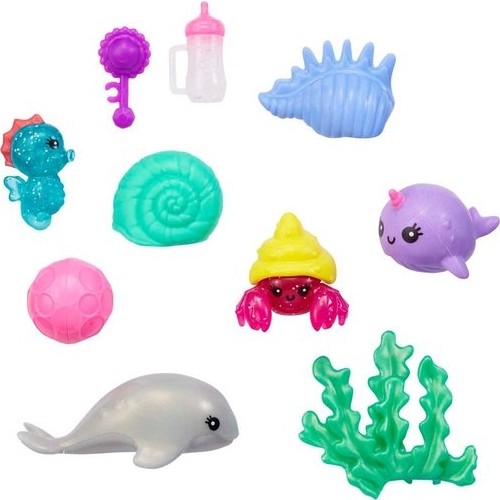 Deniz Kızı Bebekler ve oyun setleriyle deniz altında maceralara atılın. Bu set, Chelsea Deniz Kızı Bebek ve birlikte zaman geçirmeyi çok sevdiği dört minik deniz canlısı dostuyla büyülü hikâyelere ilham verir. Mercan resiflerinden ilham alan oyun seti, saklanma yerlerine ve hayvan dostların oyun oynayabileceği geniş bir alana sahiptir. Deniz kabuğu bebek arabası, çıngırak, biberon ve top, bakım ve dostluk hikâyelerine ilham verir. Deniz temalı sevimli bir dönenceye sahip uyku alanı ise tatlı rüyalar için idealdir. 3 yaş ve üzeri çocuklar, en sevdikleri anları canlandırabilir veya kendi masallarını anlatabilir. Bebek tek başına yüzemez veya ayakta duramaz. Renkler ve süslemeler çeşitlilik gösterebilir. Chelsea Deniz Kızı Bebek ve oyun setiyle heyecan dolu maceralara atılın. Chelsea Deniz Kızı Bebeği'nin yavru yunus, denizatı, boynuzlu balina ve 3 farklı deniz kabuğu olan keşiş yengeciyle ilgilenmesine yardım edin. Mercan kayalıklarından ilham alan oyun setinde, saklanma yerleri ve oyun alanlarının yanı sıra sevimli bir dönence bulunan uyku alanı da vardır. Chelsea'nin deniz altındaki hayvan dostlarıyla ilgilenmesi için deniz kabuğu bebek arabası, biberon, çıngırak ve top gibi gerekli her şey bulunur. Gökkuşağı renklerinde bir kıyafet ve kuyruk giyen Chelsea'nin masalsı denizkızı stilini ekstra uzun pembe saçları mercan resiflerinden ilham alan tacı tamamlar. Barbie Deniz Hayvanları Bebekleri ile çocuklar en sevdikleri anları canlandırabilir veya kendi masallarını anlatabilir. Yaş Aralığı: 3 yaş ve üzeri